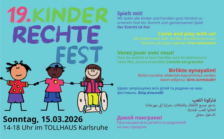 Das KinderRechteFest hat eine lange Tradition in Karlsruhe und findet bereits zum 18. Mal statt. Es gibt zahlreiche Mitmachaktionen für Kinder – kreative Mal-, Bastel-, Theater-, Koch- und Bewegungsangebote rund um den Mobibus, ein Bühnenprogramm, ein leckeres Kuchen- und Snackbuffet.