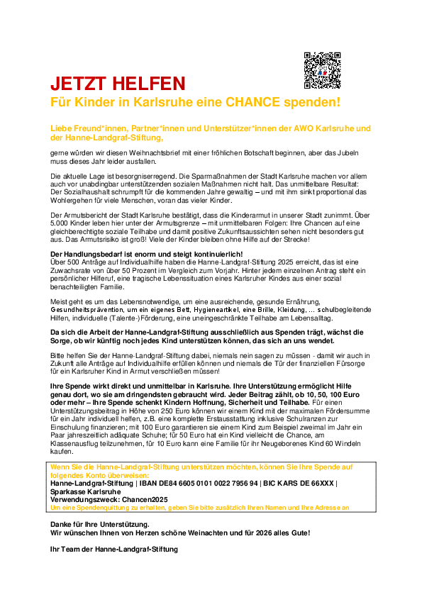 Gleiche Chancen für alle Kinder“, ist der Leitsatz der Hanne-Landgraf-Stiftung. Sie setzt sich für Karlsruher Kinder ein, die unmittelbar von Armut betroffen sind und ermöglicht ihnen somit eine Teilhabe am sozialen und kulturellen Leben. Dass Kinderarmut gerade in der Weihnachtzeit eine besondere Rolle spielt, Kinder aus sozial schwachen Familien oft vergeblich auf die Erfüllung ihres ersehnten Weihnachtswunsches warten, ist leider Realität - und nicht die Geschichte vom Sterntaler.